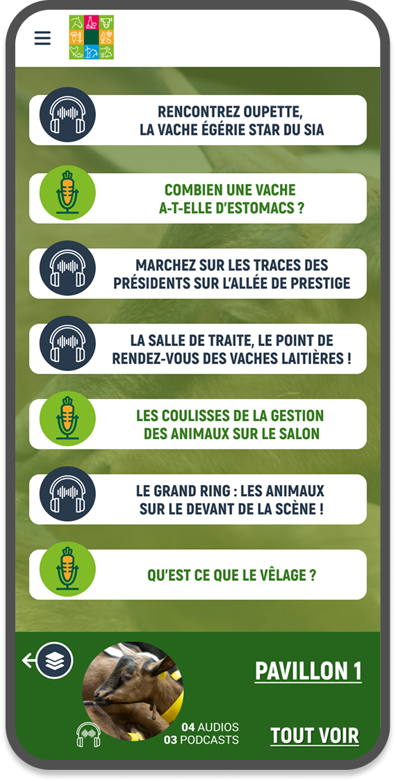Depuis 2022, Comexposium fait confiance à Yunow pour la réalisation de sa web application officielle pour le Salon International de l’Agriculture. L’édition 2025 confirme ce succès avec plus de 70 000 connexions ! Cette refonte reprend l’identité visuelle de l’affiche 2025 et met davantage en valeur les parcours audioguidés avec notamment une signalétique dédiée sur place. On retrouve toujours des contenus intégrés : plan, calendrier, exposants et chatbot.