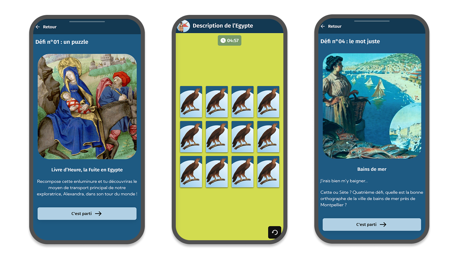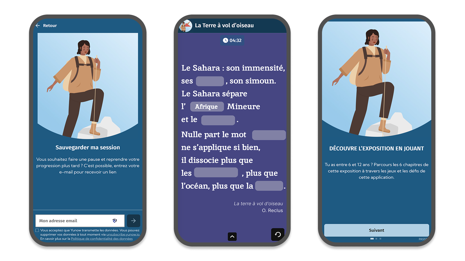 - La deuxième application est un jeu de piste accessible sur smartphone en flashant un QR Code. Une exploratrice guide le joueur dans 6 étapes de mini-jeux permettant de débloquer des fiches-contenus.