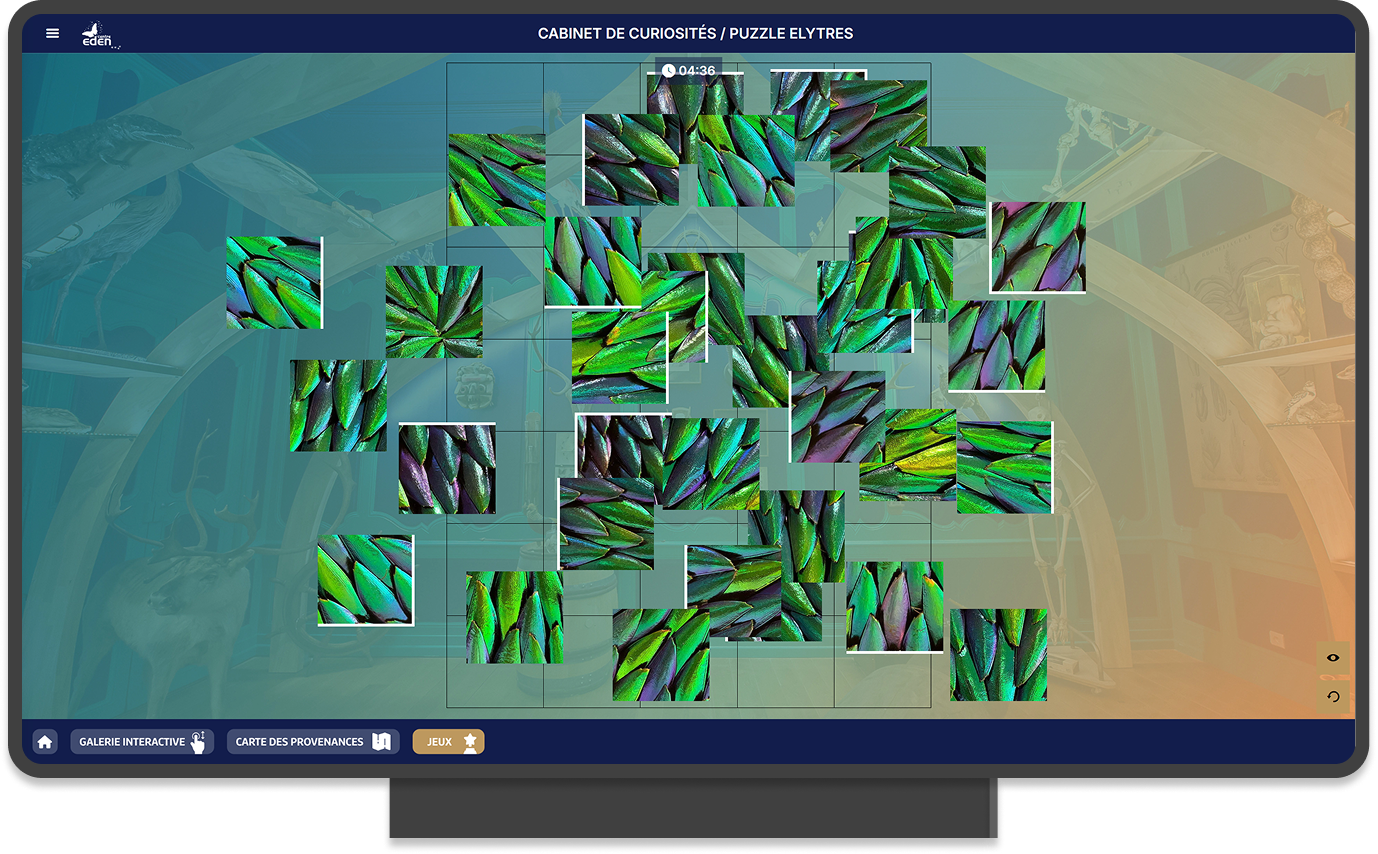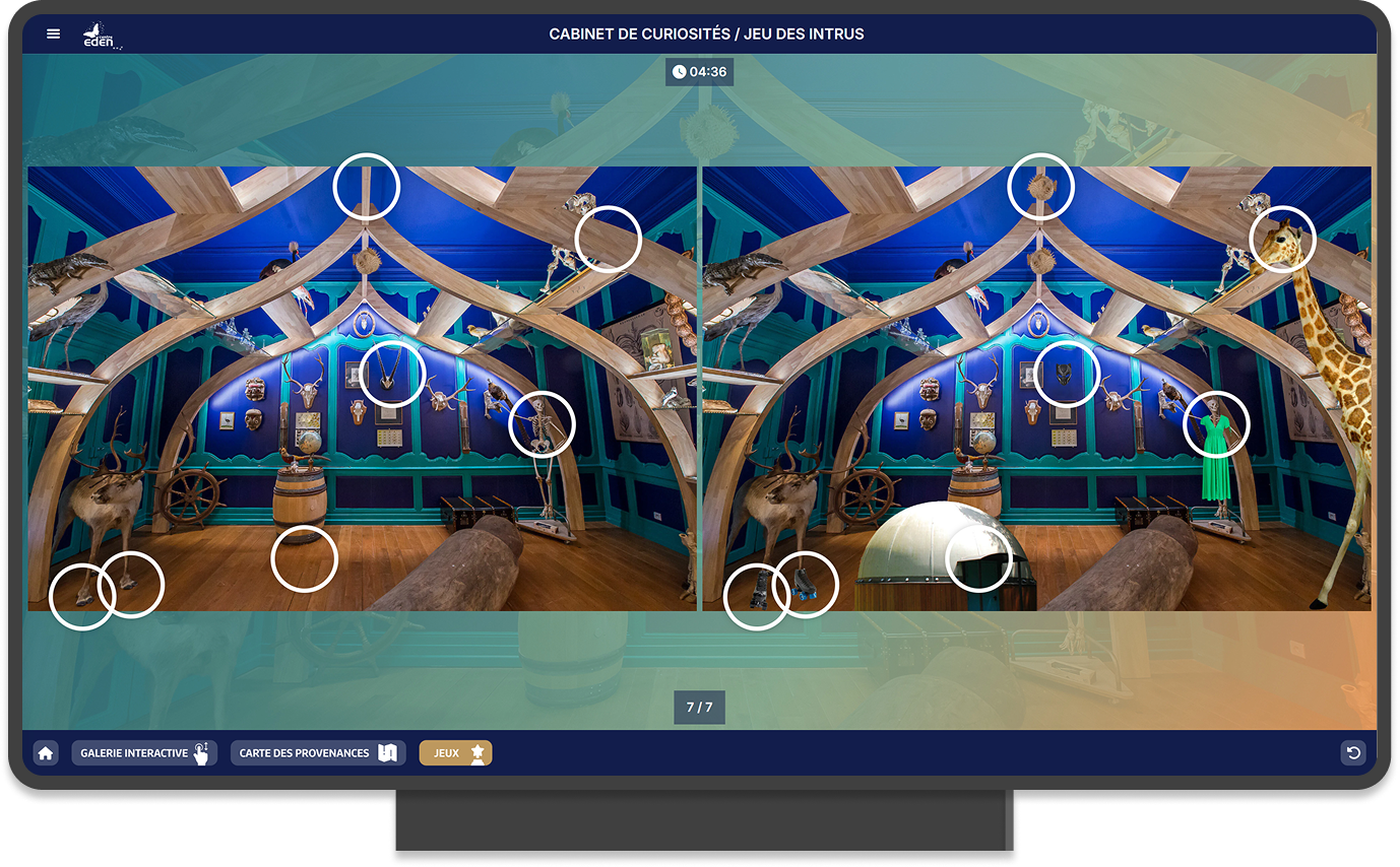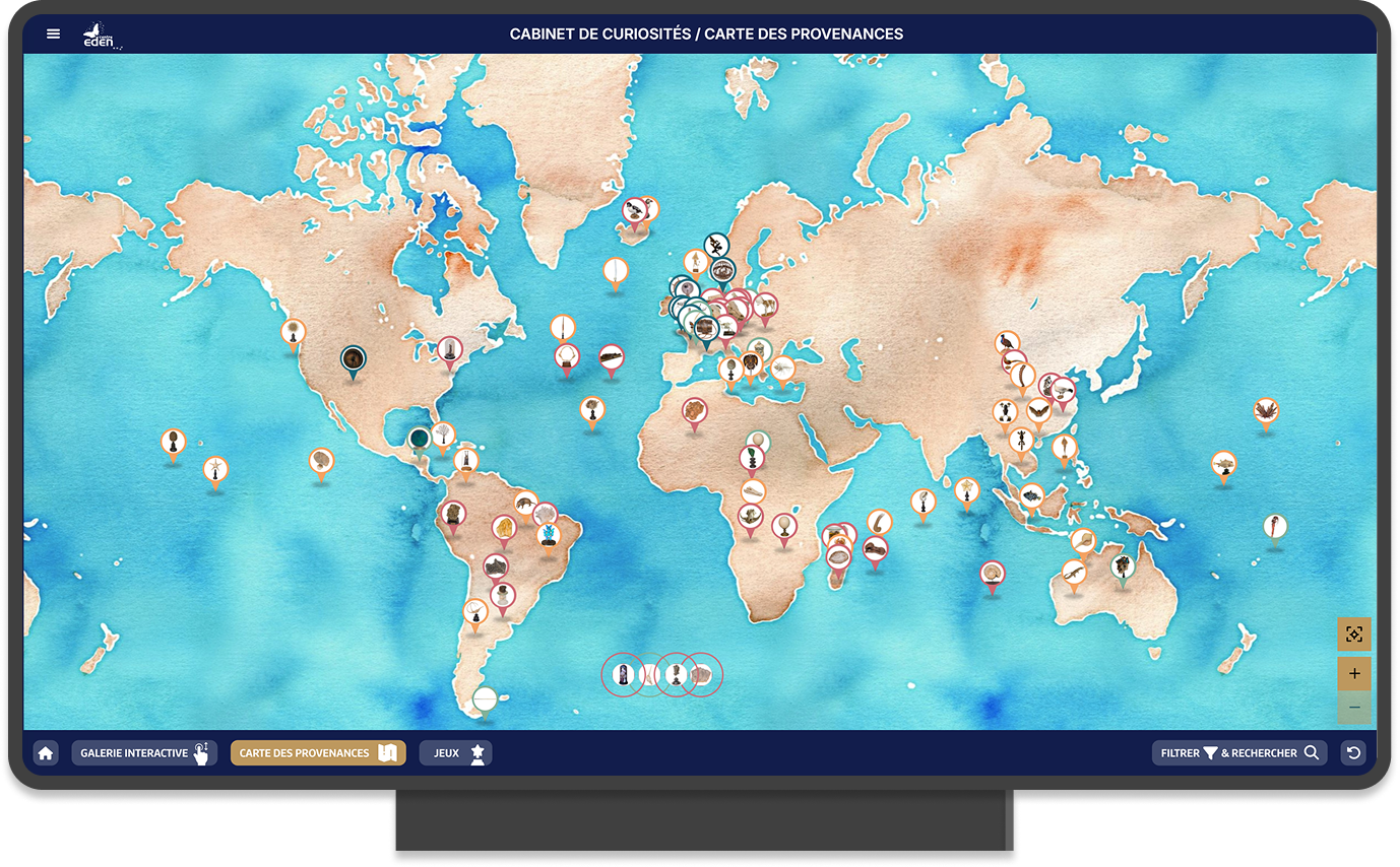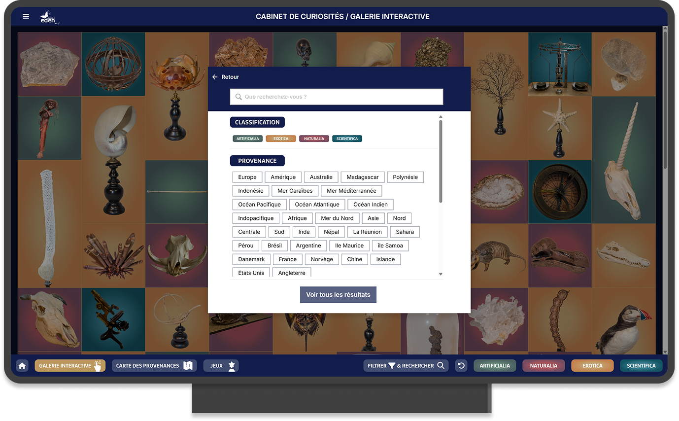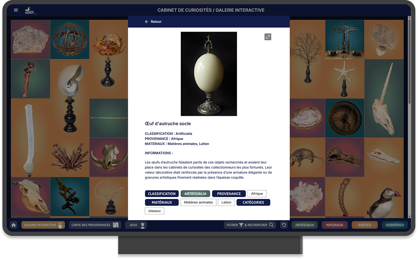 L’équipe de Yunow a réalisé pour le centre Eden à Cuisery, un site culturel du département de Saône et Loire, une application sur-mesure pour sa table tactile située au coeur de son Cabinet de curiosités. Cette galerie dynamique présente près d’une centaine d’objets sous la forme de fiches détaillées. Les contenus sont filtrables par un moteur de recherche complexe proposant l’ensemble des catégories et affichables par les quatre classifications des cabinets de curiosités. Une carte des provenances permet également de situer le pays de fabrication ou de collecte des objets.