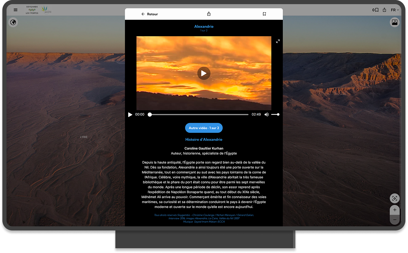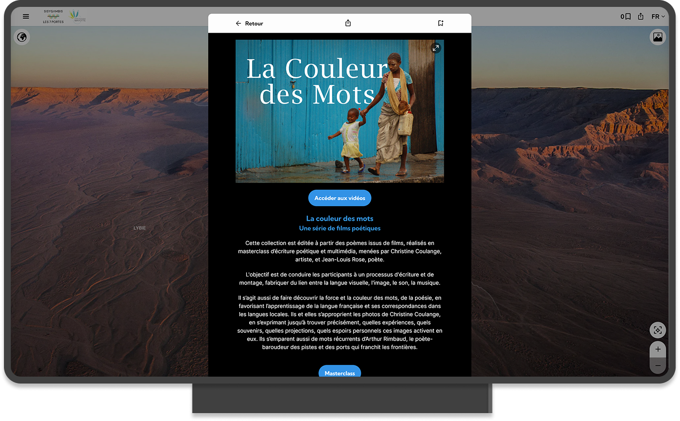 La webapplication est accessible sur mobile et table, en version en ligne et hors ligne. Elle présente un moteur de recherche évolué avec de nombreux filtres par mots-clés, catégories, types de médias, dates, etc.