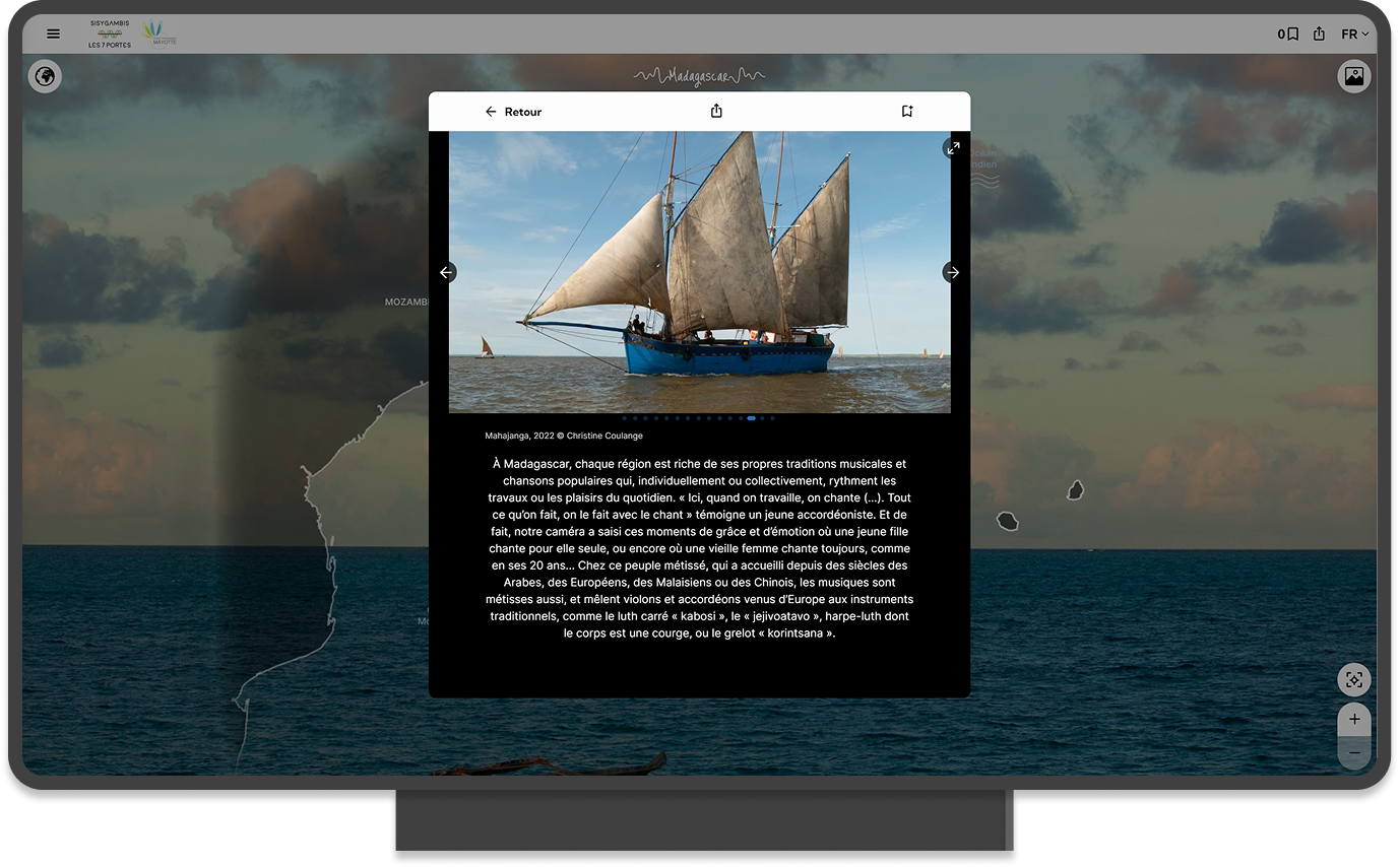 En partenariat avec le Centre universitaire français de Mayotte, le centre artistique et de production multimédia Sisygambis Les 7 portes développe un web documentaire sur les Routes de la Transe. Voyage virtuel, audiovisuel et sonore, à travers le monde des Suds, sous forme d’escales interactives, traduites en trois langues.