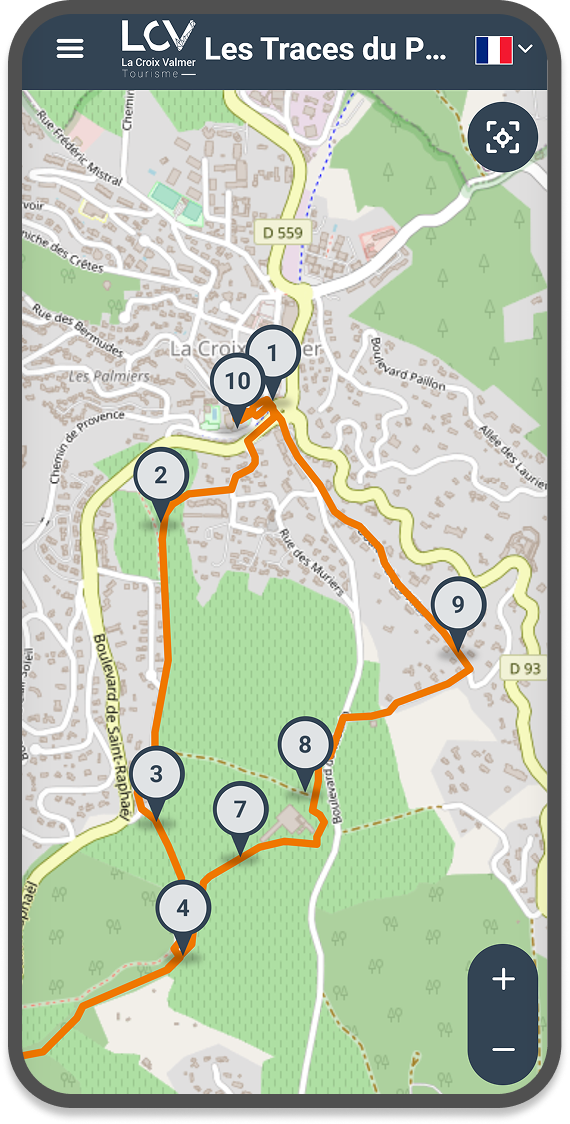 Nous avons créé une application de parcours audioguidé pour l’office de tourisme de La Croix Valmer dans le Var. Un menu permet d’accéder à 4 parcours sur une carte interactive où l’utilisateur peut se géolocaliser. Chaque parcours comporte un tracé coloré (au format Geojson) et une dizaine de points d’écoute. L’application est entièrement traduite en 3 langues, auquel on accède très facilement depuis la barre de menu.