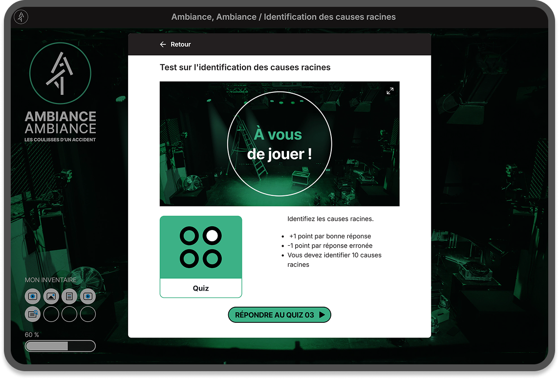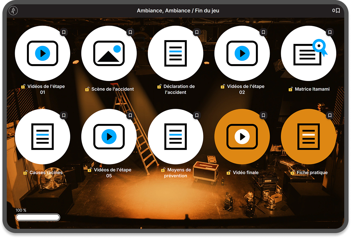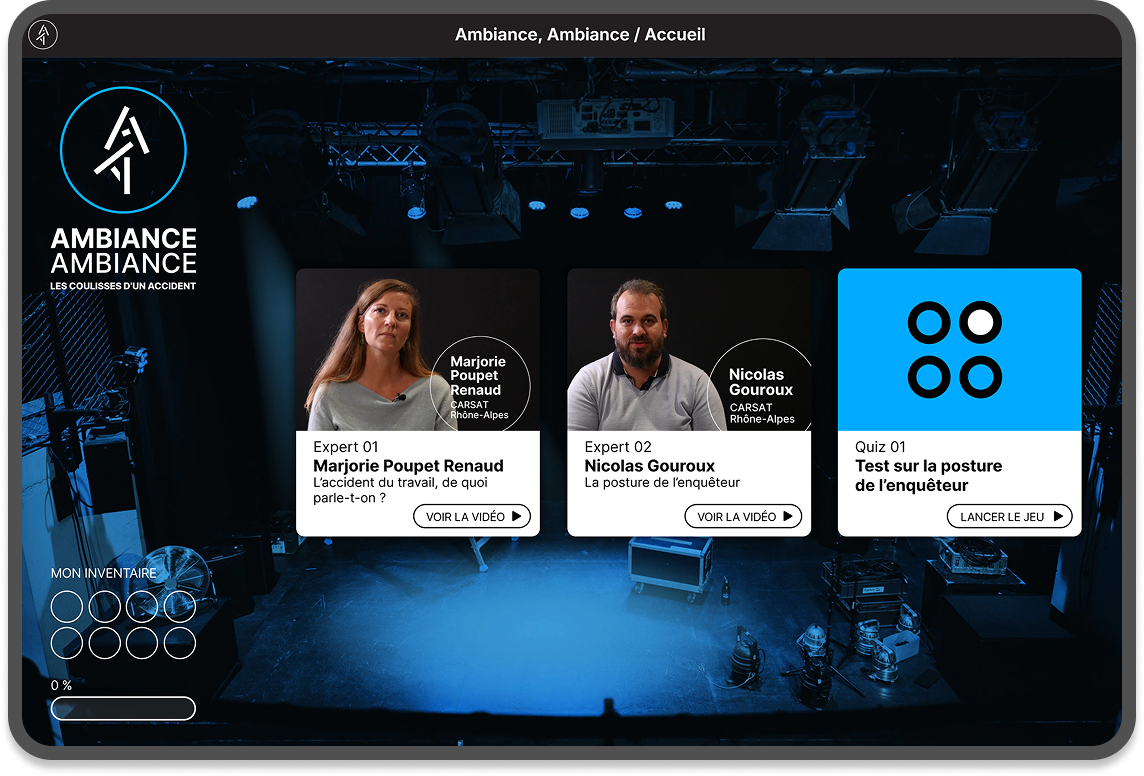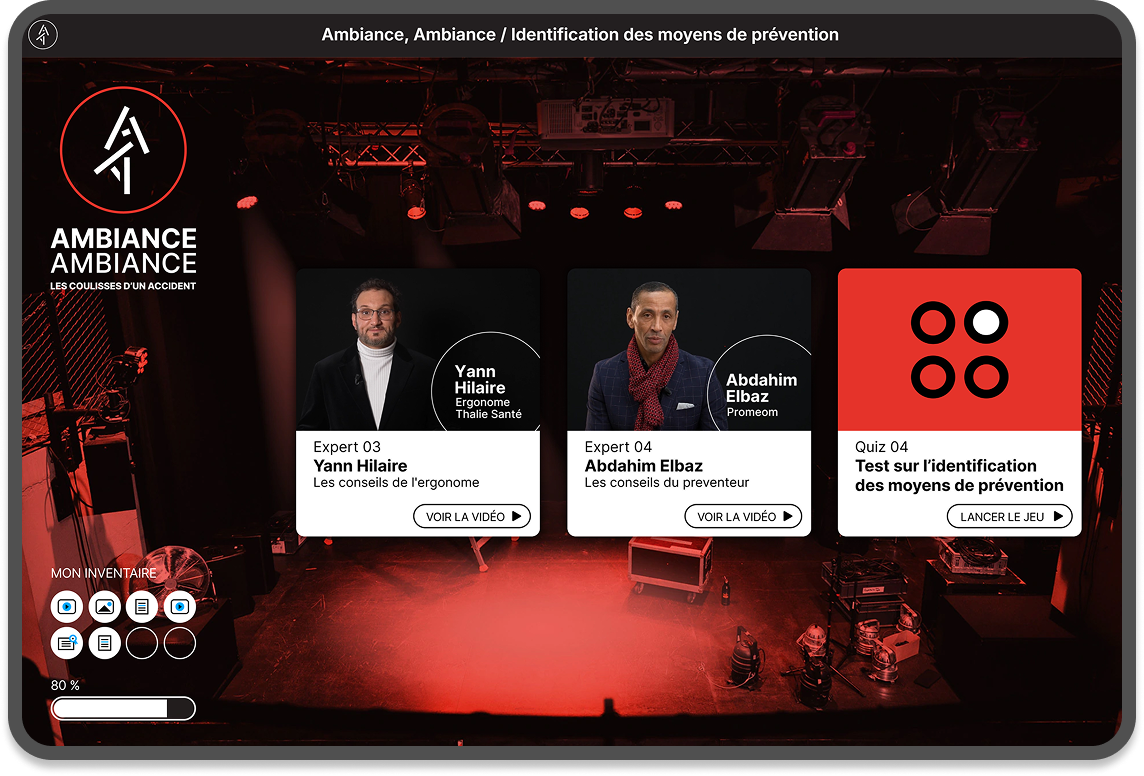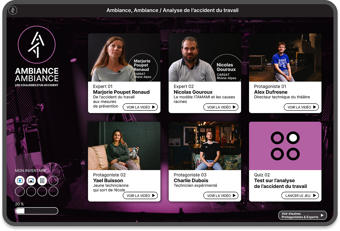 Yunow a réalisé pour les Nuits de Fourvière un jeu sérieux sur la prévention des risques à destination des professionnels du spectacle vivant. Ce “serious game” pour tablette et ordinateur s’utilise en individuel et en groupe. L’identité visuelle a été réalisée en collaboration avec un studio graphique qui a également produit les audiovisuels. 5 étapes permettent de consulter des vidéos de protagonistes et experts qui vont permettre au joueur de répondre correctement aux quiz et à reconstituer une grille d'observation et d'analyse globale de situation de travail (Itamami). À chaque palier de score atteint, le joueur débloque des éléments dans son inventaire et peut poursuivre le jeu vers l’étape suivante.