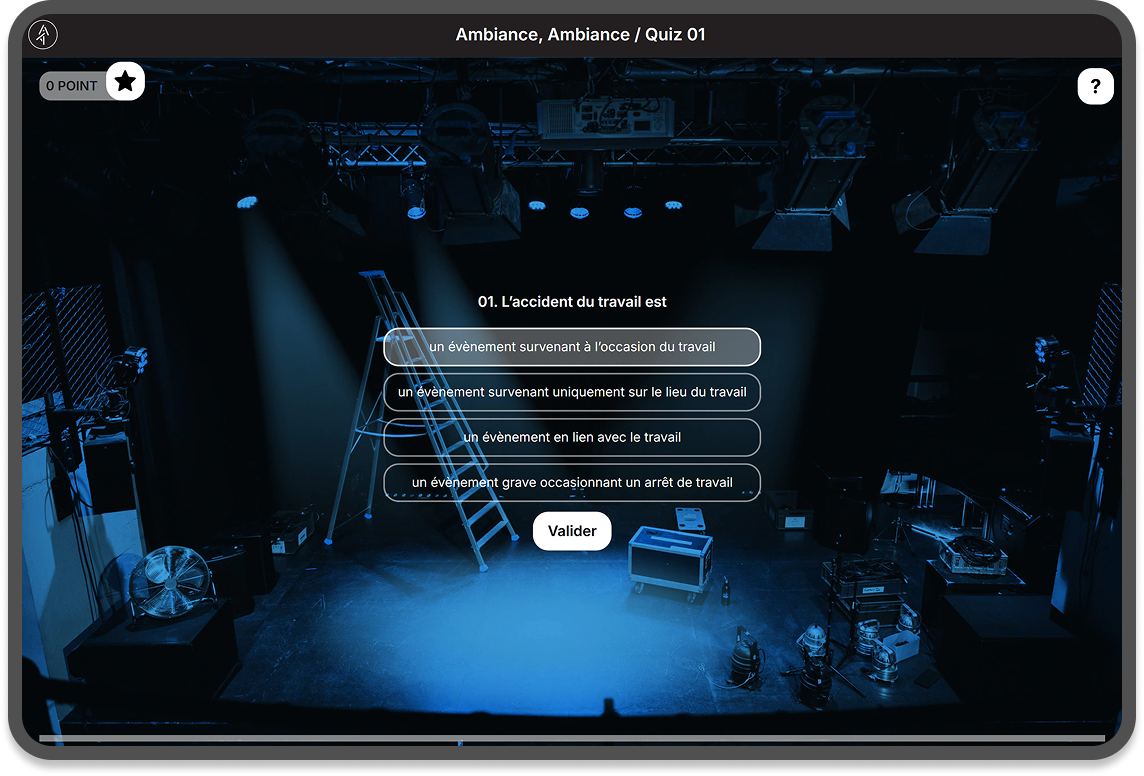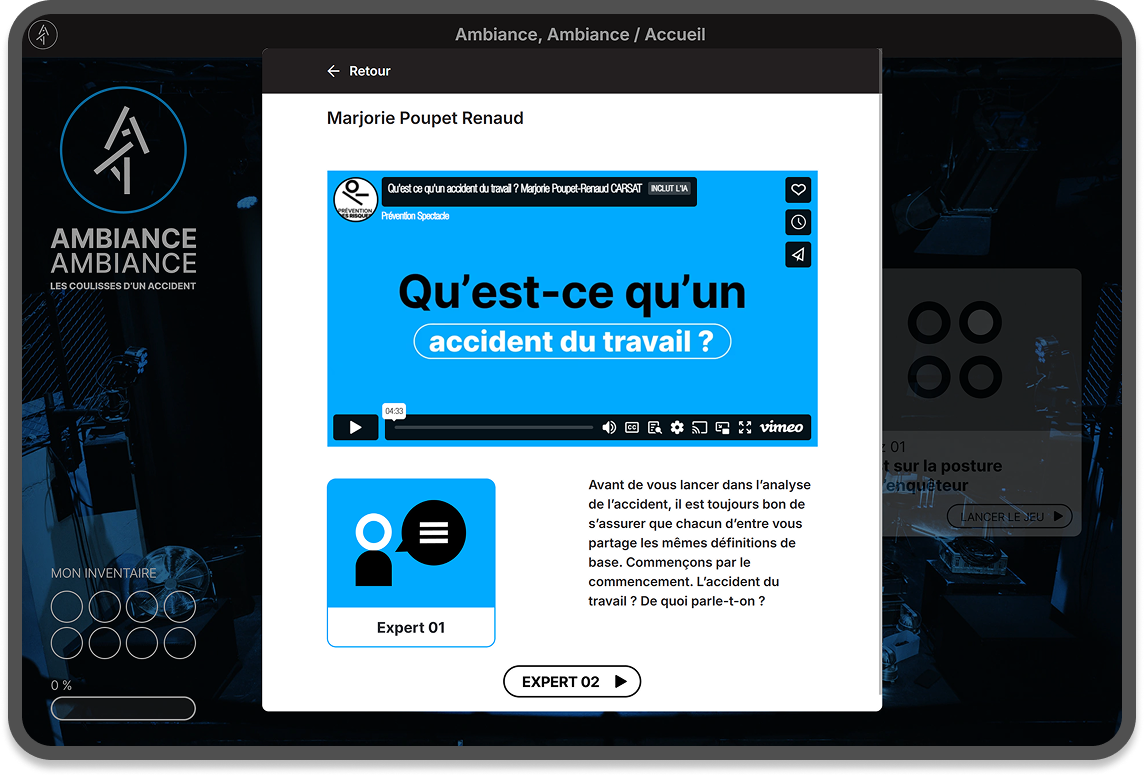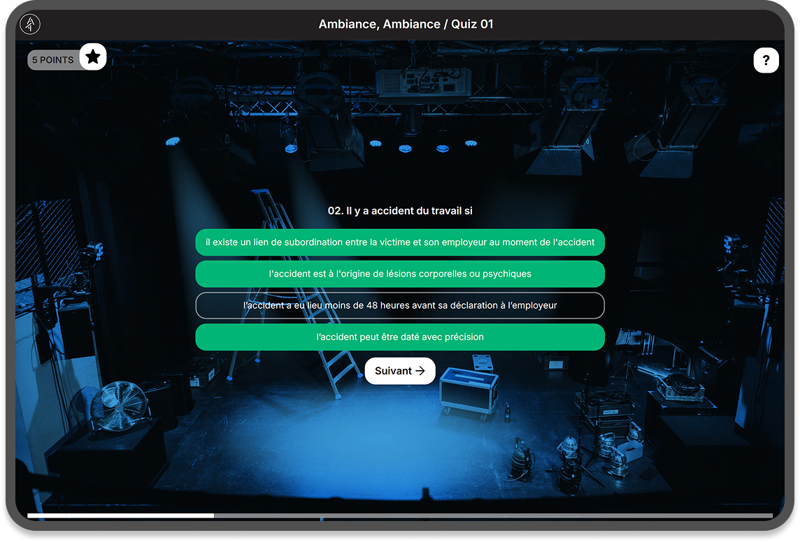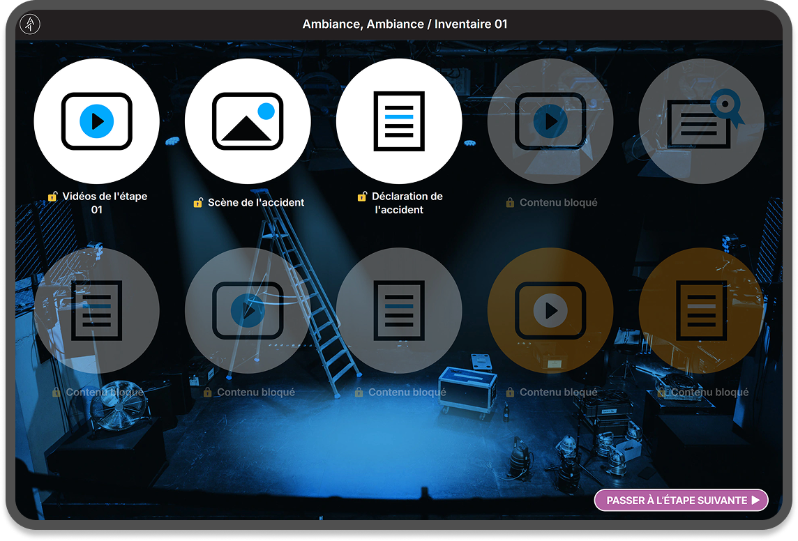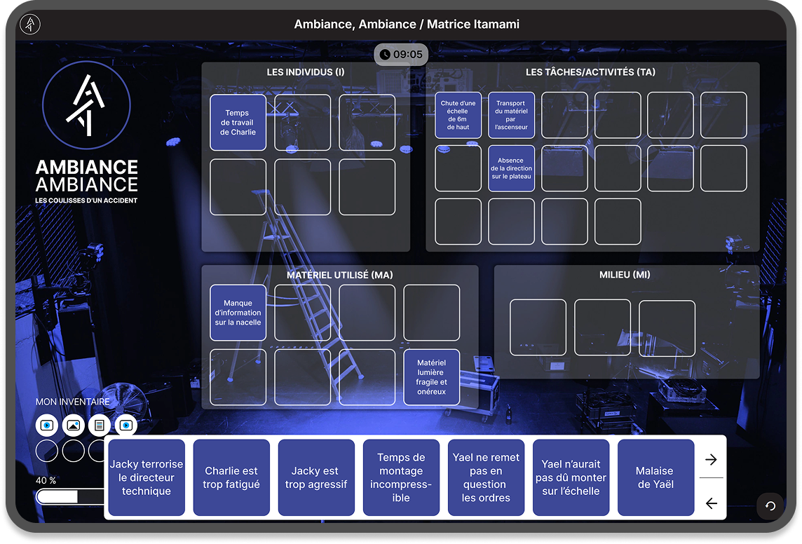 Yunow a réalisé pour les Nuits de Fourvière un jeu sérieux sur la prévention des risques à destination des professionnels du spectacle vivant. Ce “serious game” pour tablette et ordinateur s’utilise en individuel et en groupe. L’identité visuelle a été réalisée en collaboration avec un studio graphique qui a également produit les audiovisuels. 5 étapes permettent de consulter des vidéos de protagonistes et experts qui vont permettre au joueur de répondre correctement aux quiz et à reconstituer une grille d'observation et d'analyse globale de situation de travail (Itamami). À chaque palier de score atteint, le joueur débloque des éléments dans son inventaire et peut poursuivre le jeu vers l’étape suivante.