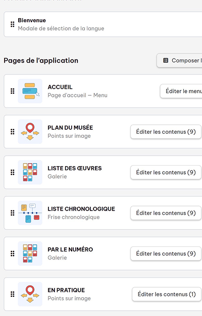 L’application est modulable dans son entièreté. Chaque page peut être actualisée avec un nouvel arrière-plan, de nouveaux boutons de navigation et des composants activables ou non : modale d’introduction et/ou de conclusion, moteur de recherche, envoi des contenus par e-mail, partage sous la forme d’un panier de sélection, géolocalisation, chronomètre, séquence de navigation...