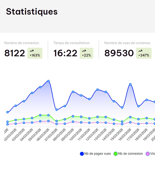 Notre solution possède un puissant outil de statistiques qui permet de visualiser en temps réel les données sur : les pages ; les contenus ; les thématiques (catégories) et ce sur une période précise ou pré-définie et en fonction de la langue.